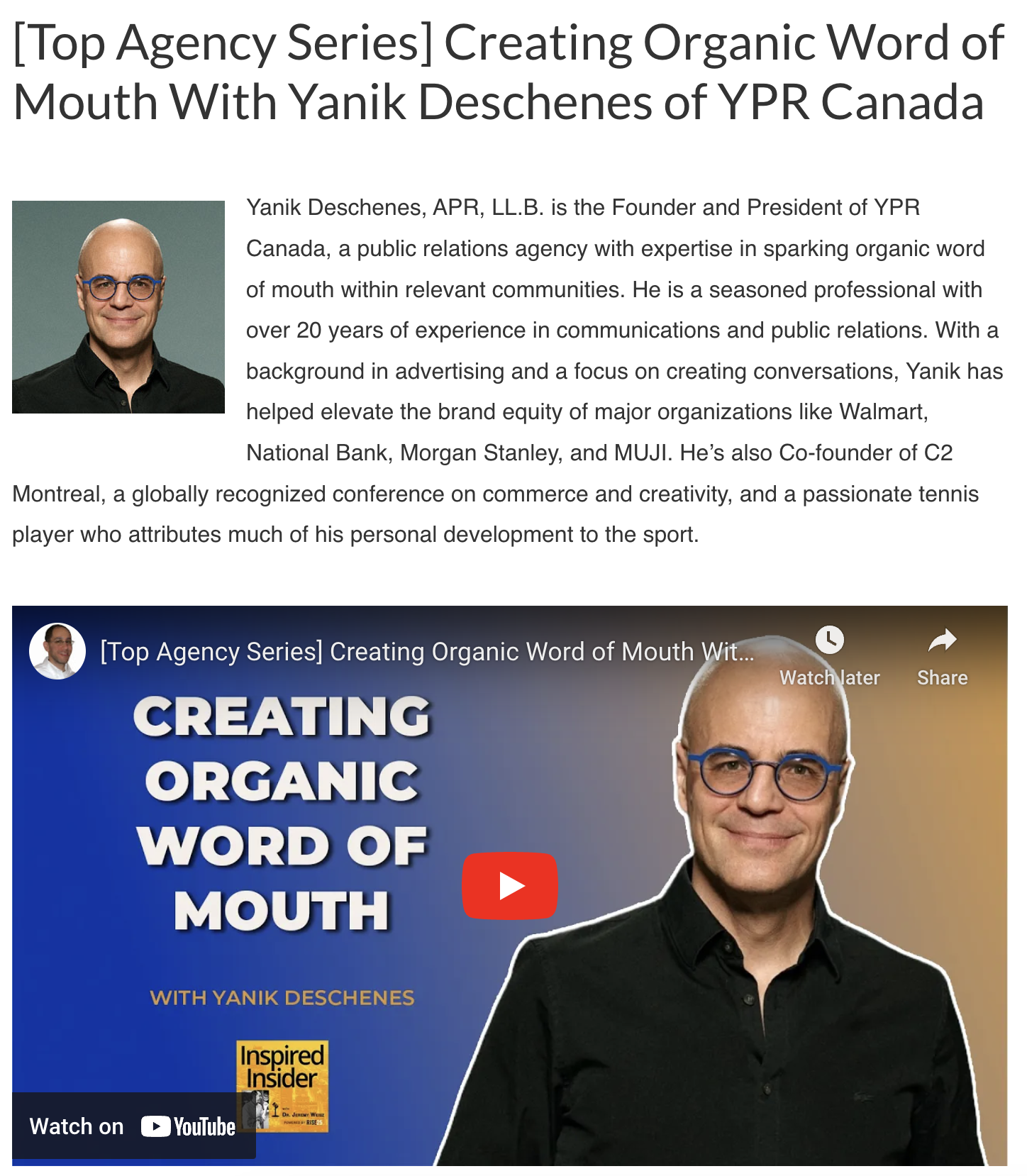 Par la suite, en 2018, Yanik a fondé YPR avec l’ambition d’aider les organisations et les marques à créer du bouche à oreille organique auprès des communautés pertinentes. L’objectif de YPR est d’accroître la crédibilité, de générer des revenus et d’augmenter la capitalisation. Avec des bureaux à Montréal, Toronto et New York, YPR génère chaque jour des conversations qui renforcent l’équité de marque.